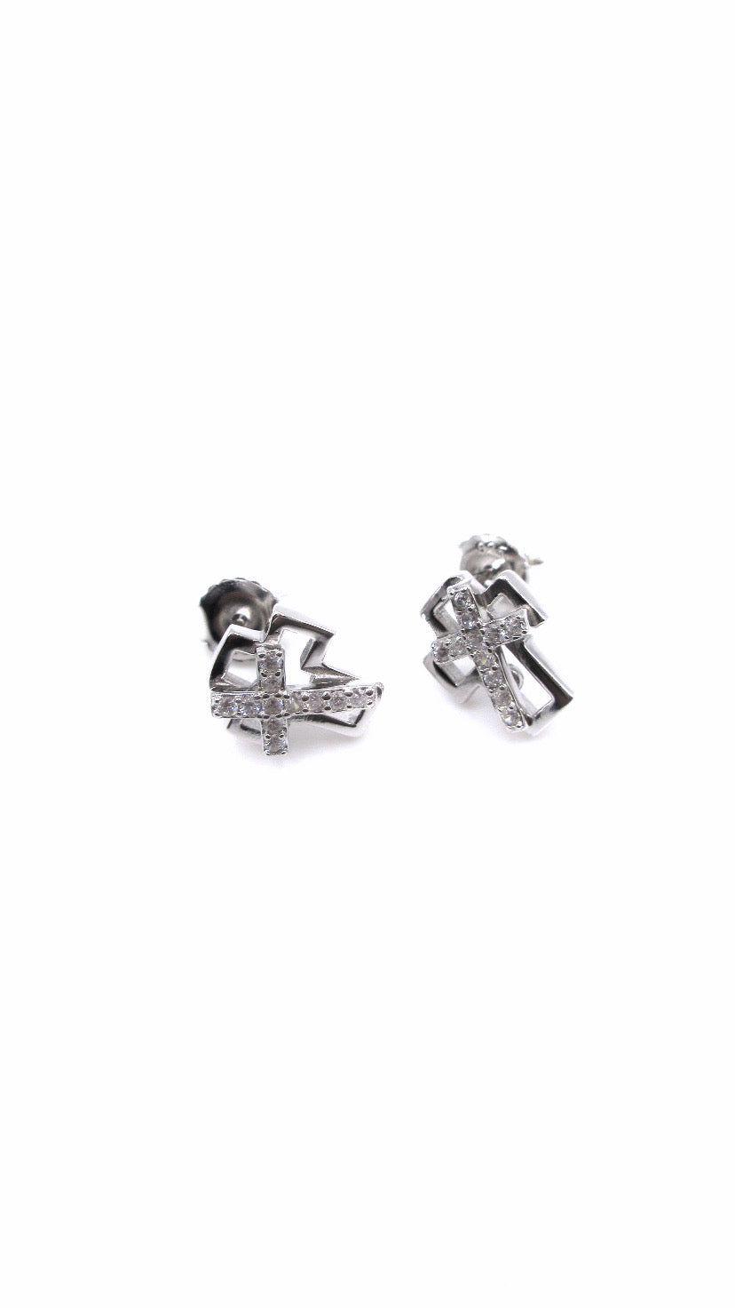 These earrings are shaped small crosses, crafted from a shiny metal, likely silver or white gold. Each cross is embellished with tiny sparkling stones, adding a touch of elegance and brilliance. The design is simple yet stylish, making them a versatile accessory suitable for various occasions.