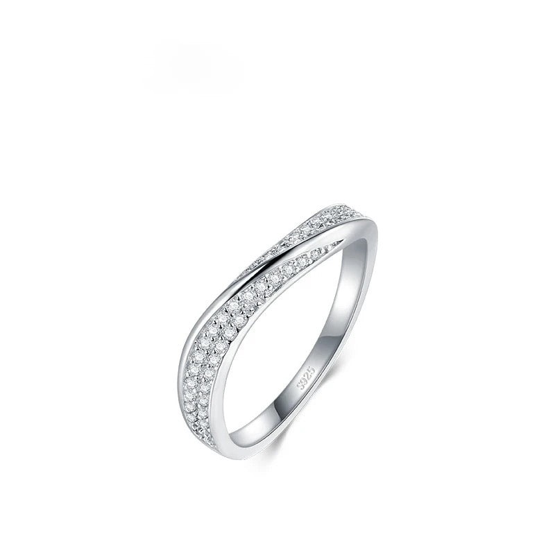 This ring features a sleek, modern design with a twist detail. It is adorned with multiple small, sparkling stones that are set along the curved band, giving it a dazzling appearance. The ring appears to be made of a shiny silver-colored metal, possibly sterling silver or white gold, and has a smooth, polished finish. The inside of the band is marked with "925," indicating it is sterling silver. Overall, it is an elegant and contemporary piece of jewellery.