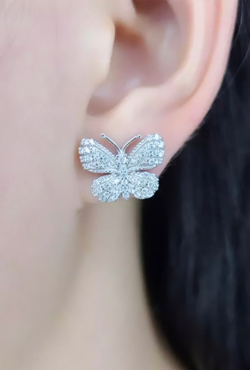 These earrings are beautifully designed in the shape of a butterfly. They are silver in color and feature intricate detailing that mimics the delicate wings of a butterfly, with tiny sparkling elements that add to their elegance. The earrings have a three-dimensional, textured appearance, giving them a graceful and sophisticated look. The butterfly design makes them both charming and eye-catching, suitable for both casual and formal occasions.