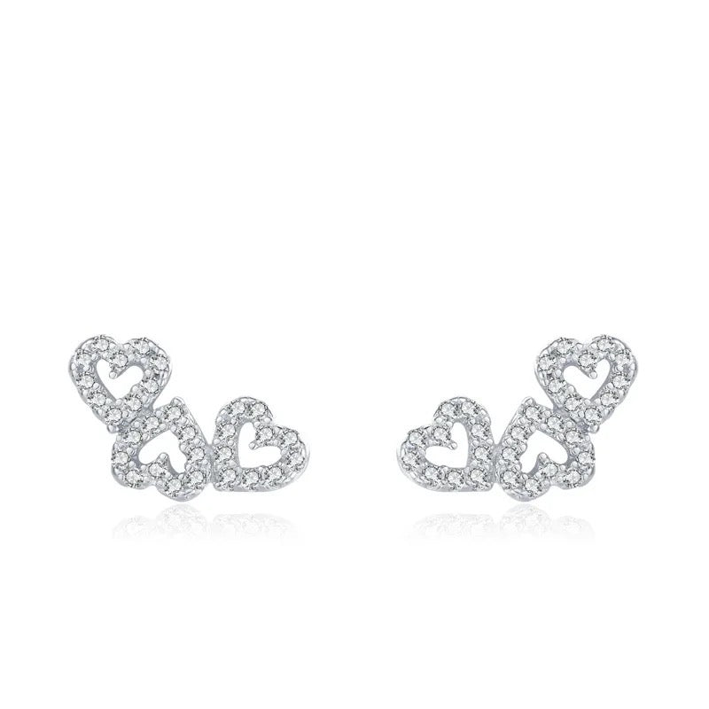 These earrings are delicate and charming, designed with a cluster of three interconnected hearts on each earring. Each heart is outlined with tiny, sparkling stones that give them a shimmering, radiant appearance. The overall look is elegant and romantic, perfect for adding a touch of sparkle and love to any outfit.