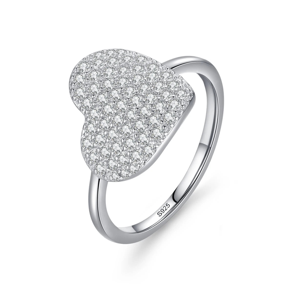 This is a charming and delicate heart-shaped ring, crafted from sterling silver (marked S925). The design features two intertwined hearts, one of which is adorned with a row of sparkling, tiny crystals that add a touch of brilliance and elegance. The open-heart motif symbolizes love and affection, creating a romantic and tender feeling. The sleek, polished band enhances the dainty and graceful aesthetic, making it a perfect piece to express love or to add a sweet, meaningful touch to your jewellery collection.