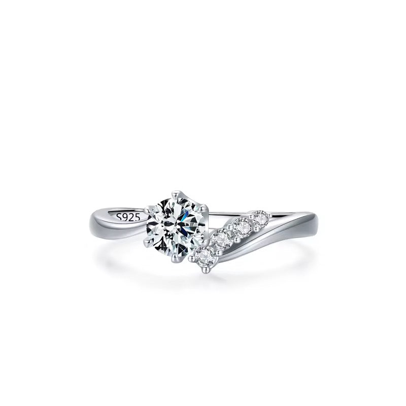 This elegant ring features a stunning central round-cut diamond that captures the light with brilliance and sparkle. The band, crafted in sleek sterling silver marked with "S925," gracefully curves and is adorned with a delicate row of smaller sparkling stones that add a touch of sophistication and shimmer. The design combines timeless beauty with modern elegance, making it a perfect symbol of love and commitment. Its refined craftsmanship and luminous stones make this ring a captivating piece for any special occasion.