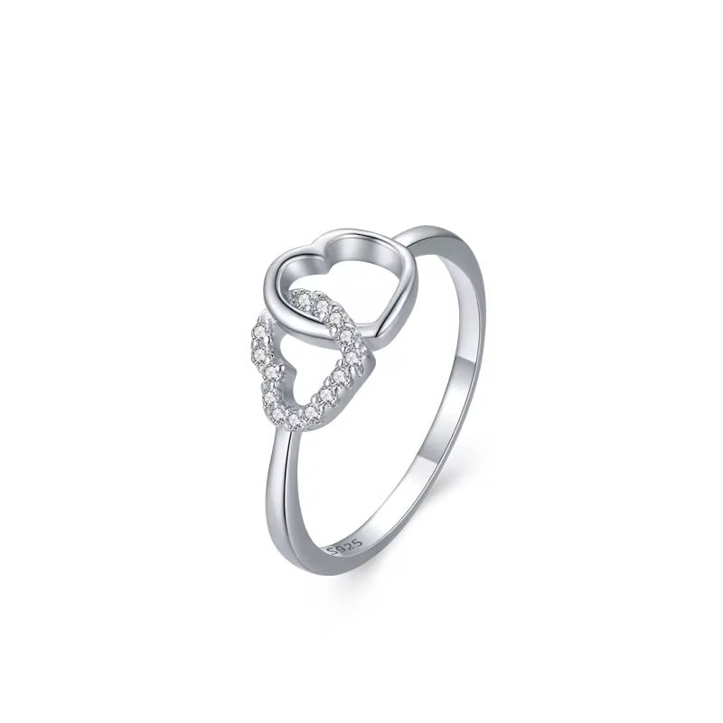 This is a charming and delicate heart-shaped ring, crafted from sterling silver (marked S925). The design features two intertwined hearts, one of which is adorned with a row of sparkling, tiny crystals that add a touch of brilliance and elegance. The open-heart motif symbolizes love and affection, creating a romantic and tender feeling. The sleek, polished band enhances the dainty and graceful aesthetic, making it a perfect piece to express love or to add a sweet, meaningful touch to your jewellery collection.